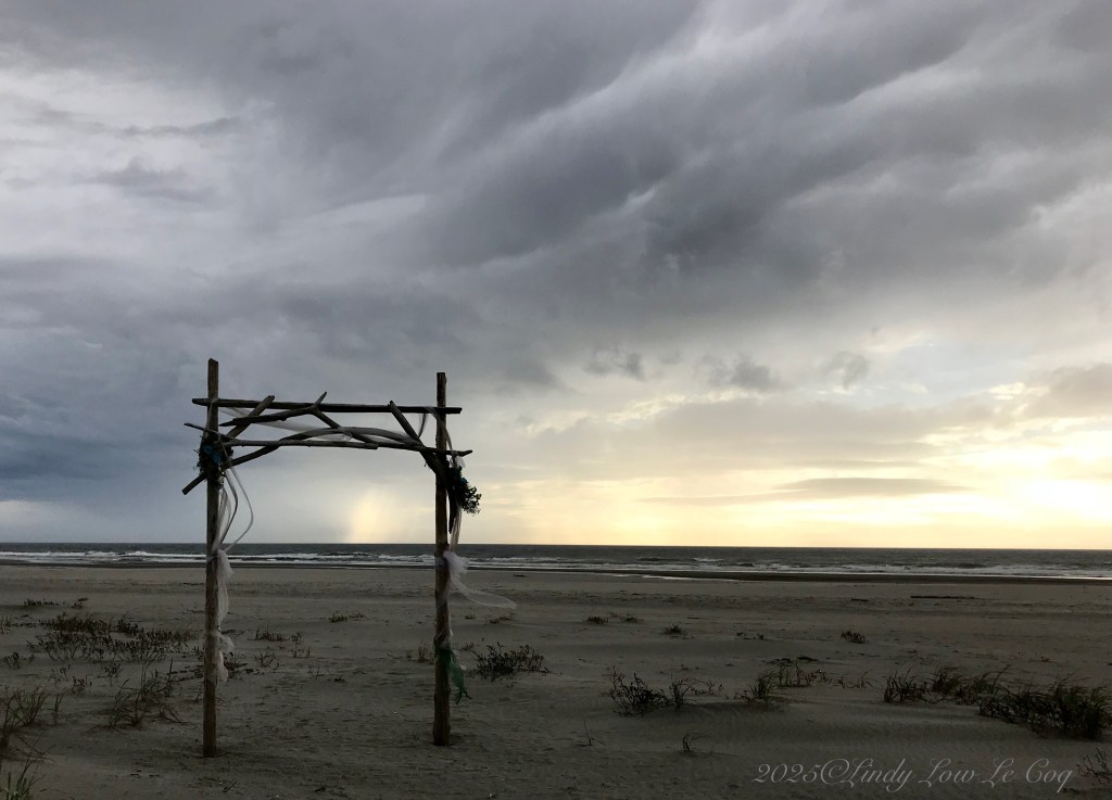 When I came upon this wedding altar on Long Beach, it was a windy September day. Rain was coming my way with a bit of sunshine struggling through the clouds, creating a vision of the mystical.
