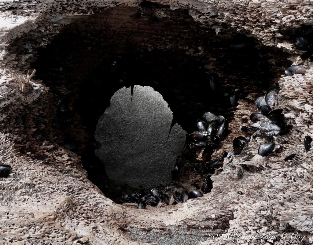 Though it looks like the open maw of a dangerous creature, this photo is of a large hole in a huge timber that had washed ashore in winter storms. It confirms my belief that one should always take a look inside holes like this to see what mystery might be hidden there.