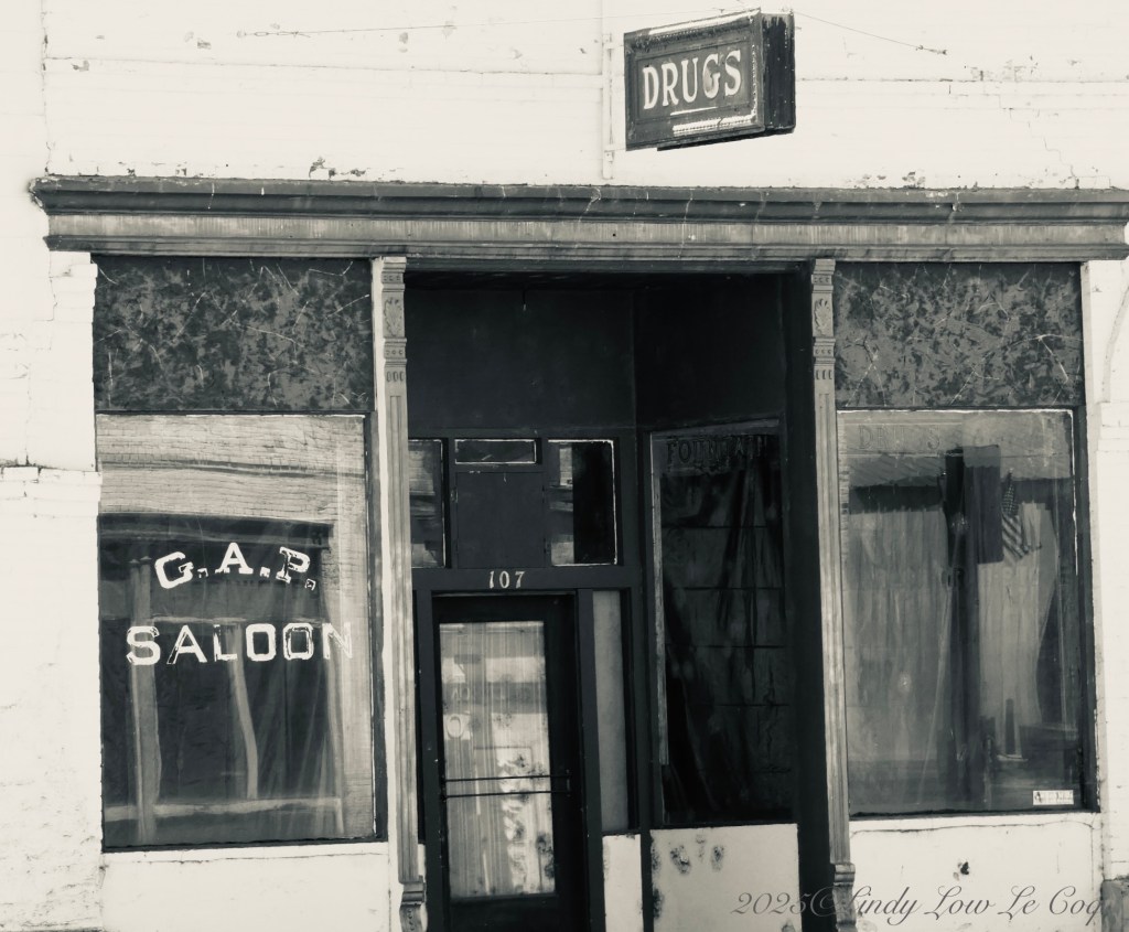 Patti points out that damaged or forgotten places have an inherent sense of mystery. Why am I taking his photo of an old pharmacy and saloon in Oakesdale, WA? I asked myself. Well, because it is shadowy, and enigmatic, and just right for this post!