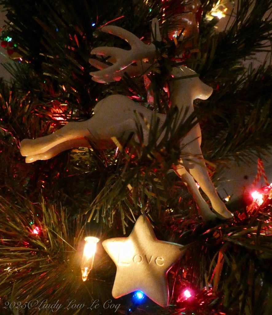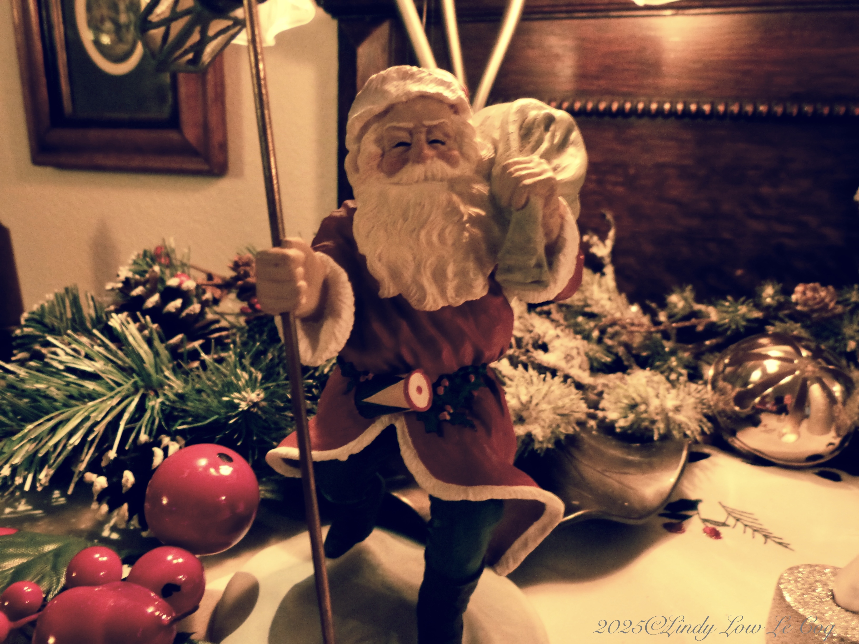 I love to decorate the inside of our house. Over the years I have accumulated quite a collection of holiday decorations. The two Santa wood carvings on the left I made soon after our 1996 visit to France. The one of the right my mother gave to me. I always kiss it when I take it out of it’s storage box, and shed a tear when I put it back in.