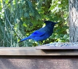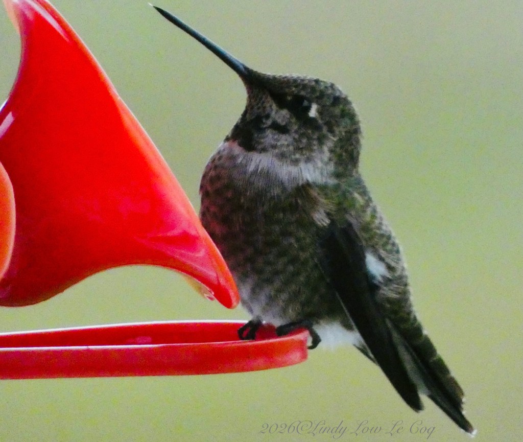 In January, before I removed the holiday decorations at our condominium in Long Beach, WA, this Black-chinned Hummingbird liked to rest in the ribbon on the deck rail between visits to our feeder,