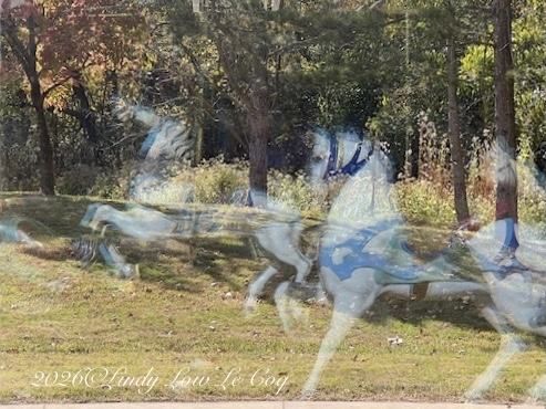 The St. Louis Carousel (1924) in Faust Park, next to the Sophia M. Sachs Butterfly House, beckoned my sisters and me to take a ride. As the carousel began to slow, I thought I’d see if I could get a shot of the horses reflections upon the inside windows, against the outside background of trees and grass. A lucky winner.