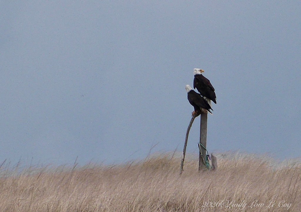 A Bald Eagle pair perched above the dune grasses, their feathers ruffled by the wind is my first choice for this challenge. It hardly needs explaining, with the foreground of grass leading to the posts and the birds nicely silhouetted upon the blue-gray sky. The larger bird on top is the female.