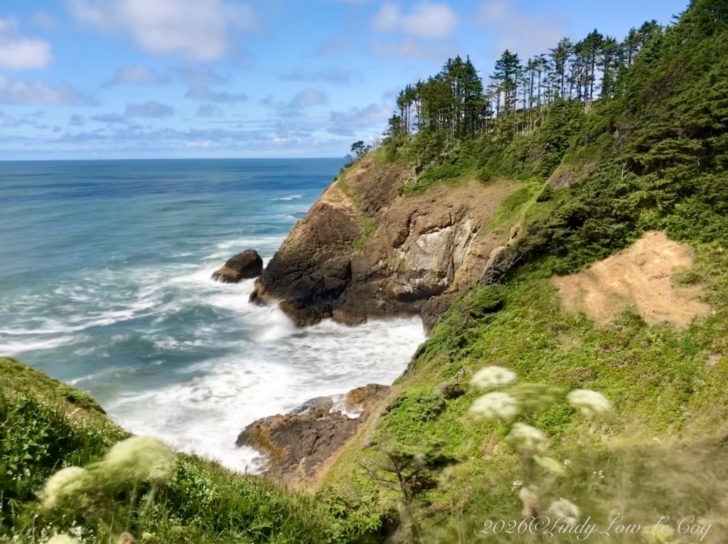 With this shot I wanted to capture some of the wildness of the Pacific Ocean surging against the shoreline at North Head. The foreground plants are blurred and the green extends up the right side of the photo. The middle ground focus is on the water churning into and against the rocky outcropping, while ocean, sky and trees fill the background.