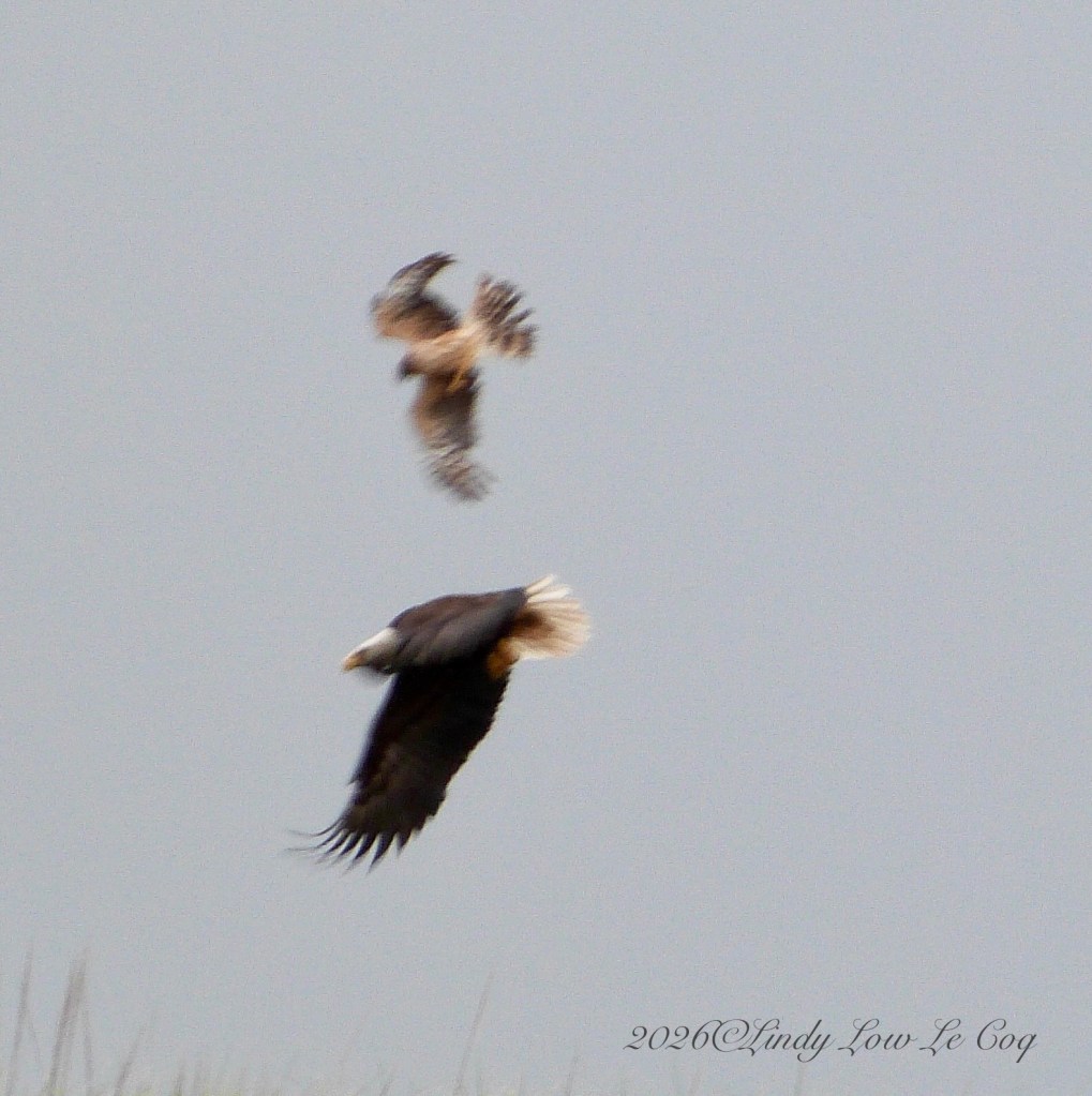 When I saw this Sharp-shinned Hawk (Accipiter striatus) harassing a Bald Eagle (Haliaeetus leucocephalus), I wanted to capture the event. The scuffle went on for a while, and again there was way too much action to get a clear shot with my equipment. Still, to get a shot at all makes it Lucky!