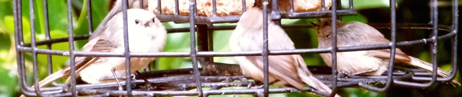 With their characteristic “spit” “spit” call, American bushtit frequently assemble in my holly tree and besiege the suet feeder with relish!