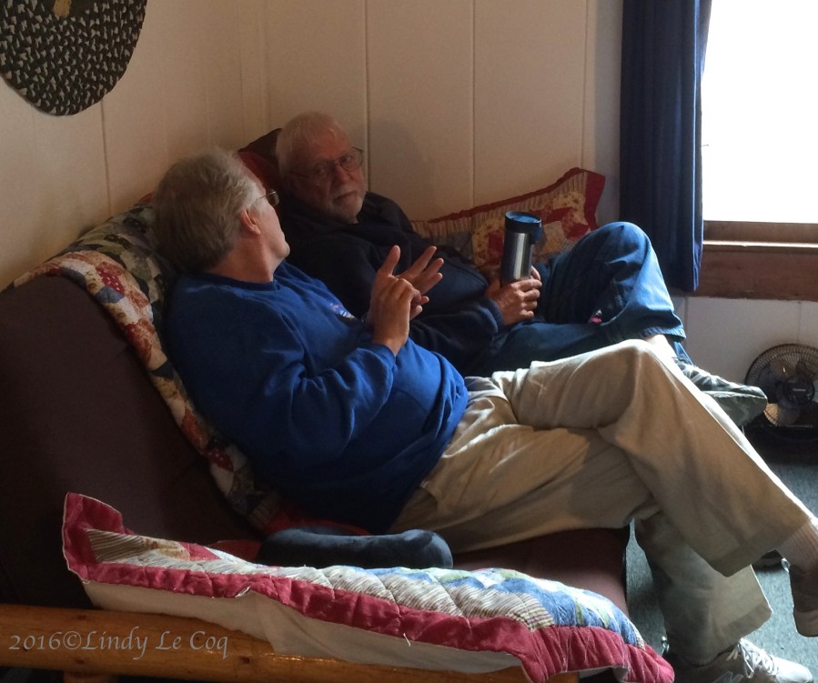 Duncan and Les enjoy morning coffee in my cabin.