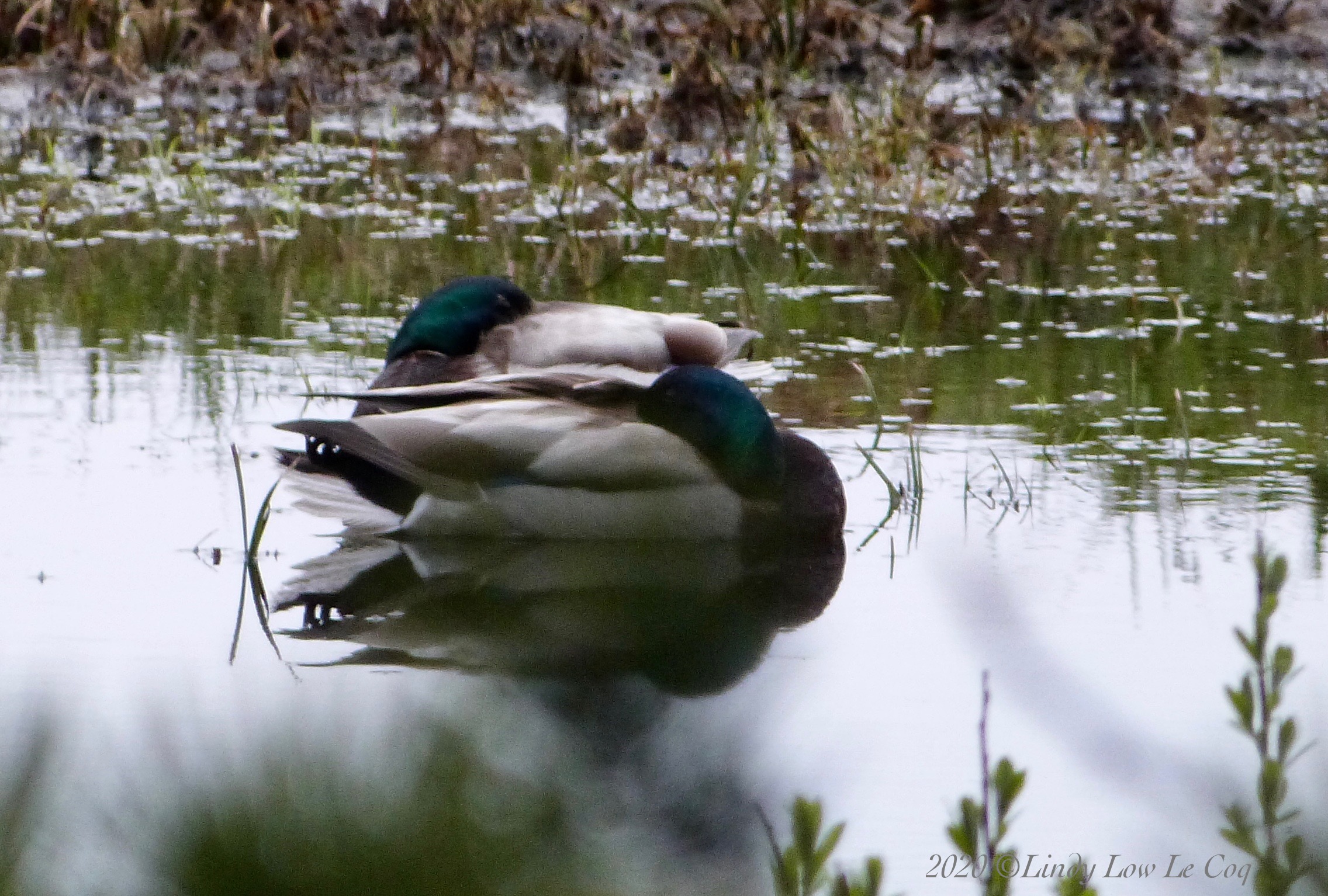 Two male Mallards are resting side-by-side with their beaks tucked under their wings, facing in opposite directions and centered in the shot. My best example of both vertical and horizontal symmetry in one image.
