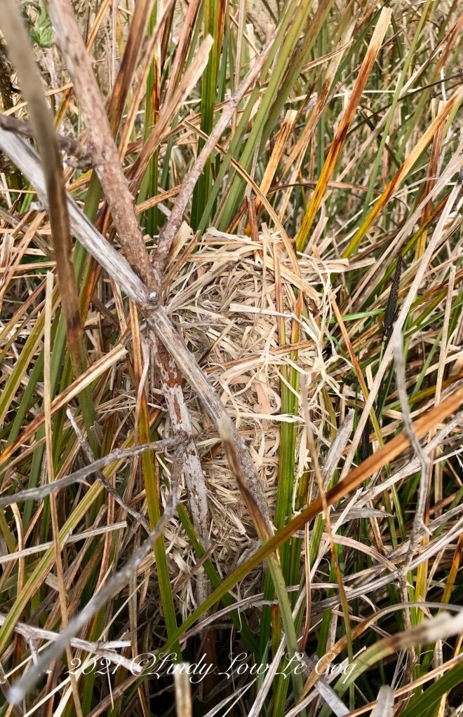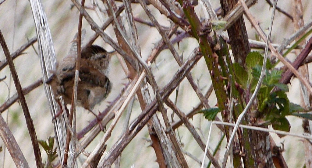 From the middle of a thicket of vines, or on the ground amid dense marsh grass, a rattled trill calls out in defiance of my presence. Wrens are notorious for sounding like they are scolding – this one seems more so because it is essentially invisible. My attempt to get a clear photo finally panned out with one clear shot after many blurry images or simply snaps of empty brambles!