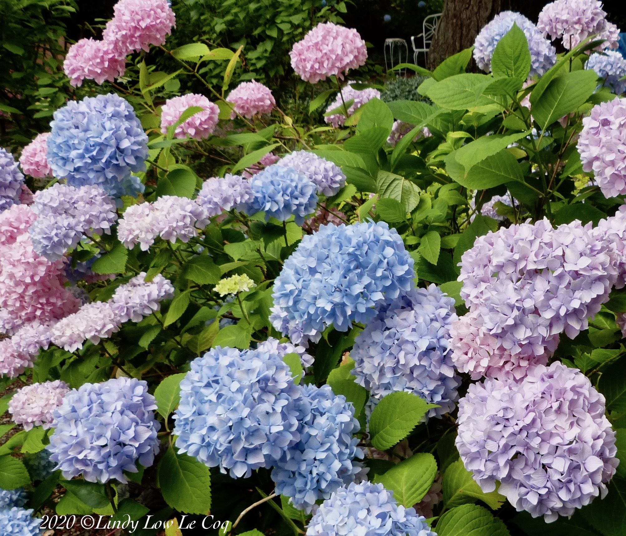 Above, spring blooming shrubs along the front gardens by the street, below a foundation planting of large Rhododendron bloom in the front yard. After the Rhododendrons fade, a glory of mop-head Hydrangea provide interest all summer into fall.