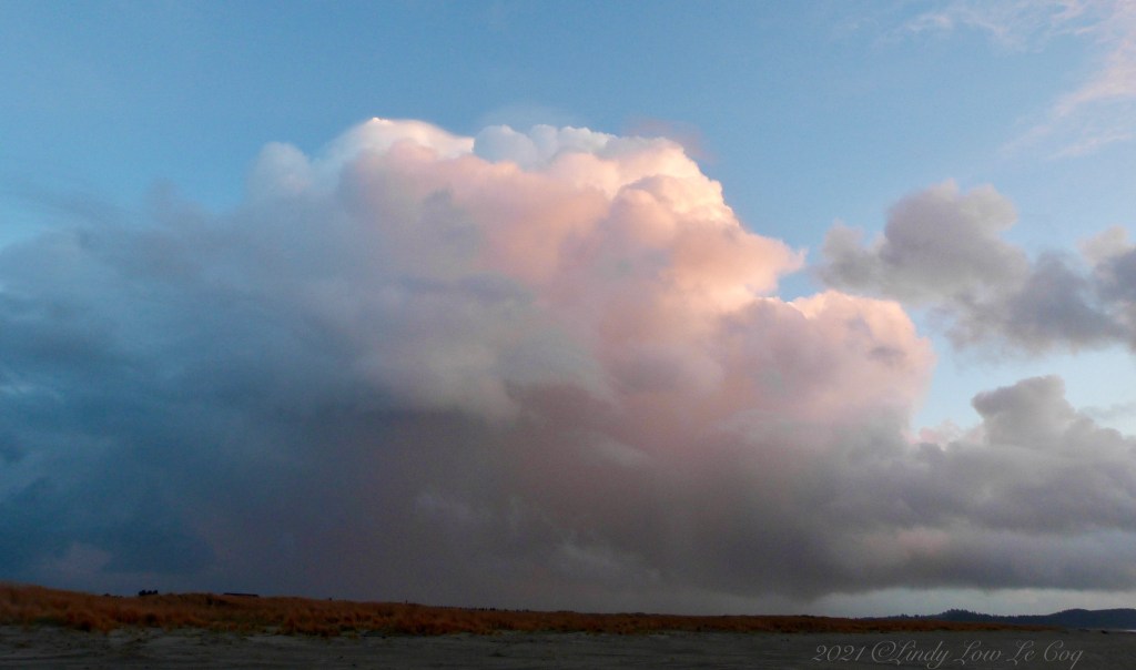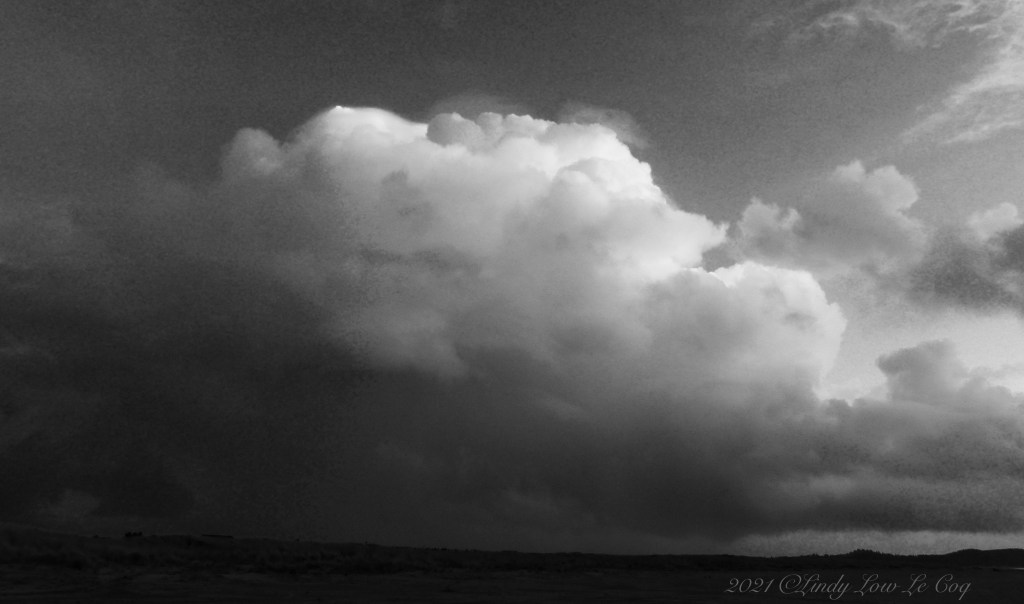 Pink tones from sunrise reflecting on this cumulus cloud made it appear soft, like cotton candy. Using a Noir filter creates a much more ominous impression.