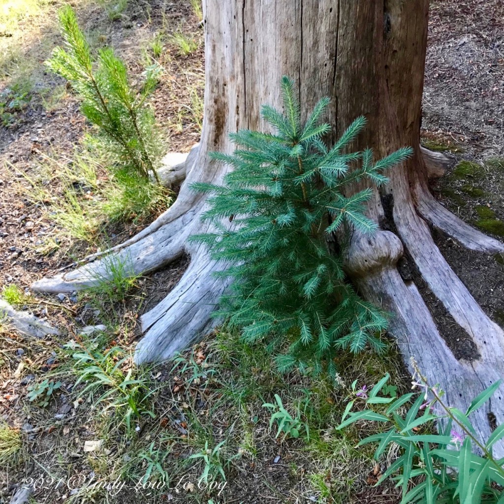 At Willamette Pass, I noticed small trees that were thriving under the canopy of fully grown evergreens, and also, as in this photo, being nurtured by the remains of deceased trees.