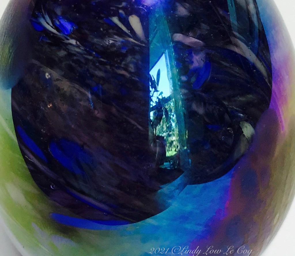 This lovely blown glass paperweight mirrors a window with a view outside and a plant in front of it. So much movement – the magic of reflections!