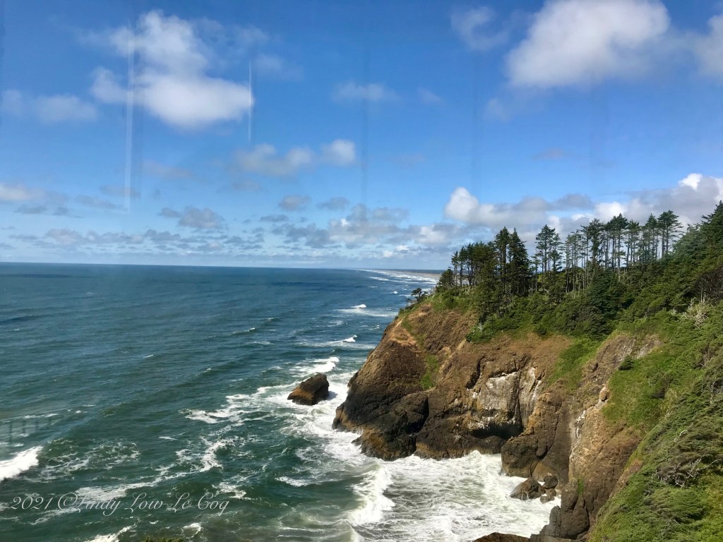 A view out the observatory windows of North Head Lighthouse at Cape Disappointment State Park. Notice how the vertical lines of the window panes behind me, are reflected on the glass in front of me.