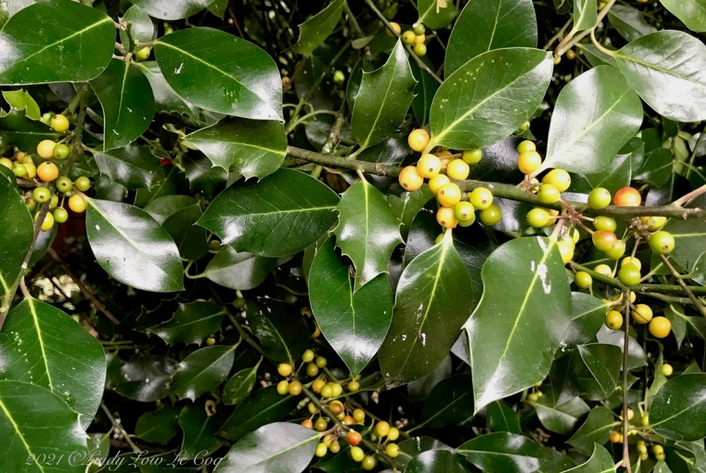 The stand of holly in my back yard is a favorite place for birds to rest, nest and shelter. Holly berries start out lime green and begin turning yellow this time of year. The color shift continues shading to orange, carnelian and by December, the bright red of Christmas wreaths.