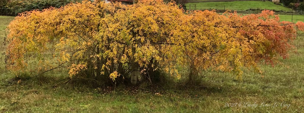 In spring this Wild Rose is smothered in pink flowers and alive with pollinators. Now it drapes a mantle of golden foliage over its old host fence.