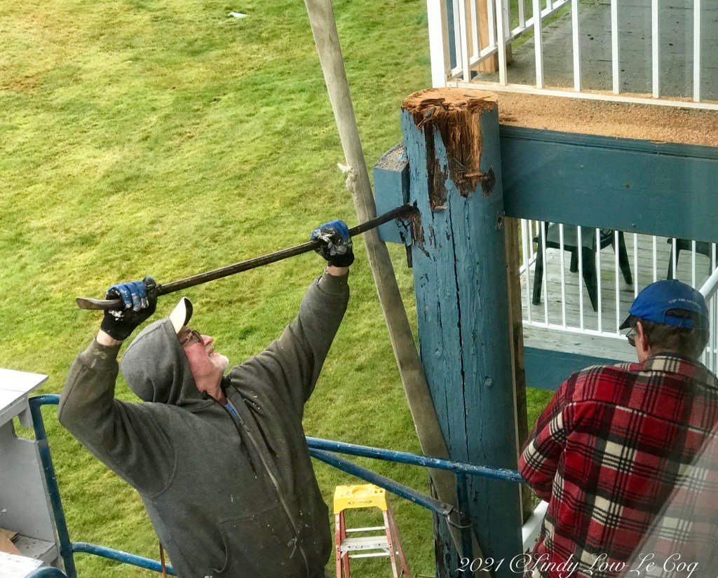 Left – rotted pole being taken away. Middle – new pole being set into place. Right – securing new pole to structure. In the center photo you can see blue poles along the front of the building in the background.