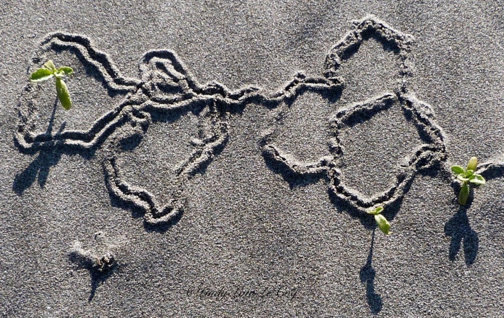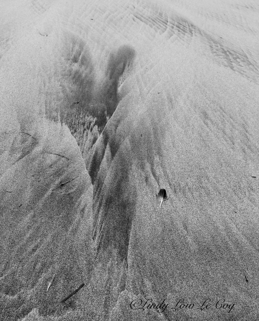 Our constant Pacific Ocean wave activity on the Long Beach Peninsula (WA) creates what I call ‘natural sand-paintings’. One of my favorites is this image that appears to me as an angel, with wispy wings on either side of the face, as it reaches for the feather.