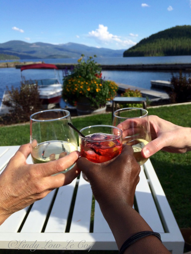 To have fun and raise a glass of cheer most certainly fits the theme. The photo above was taken by Jocelyn when Creighton and I visited her at Priest Lake, Idaho. We were basking in the beautiful scenery at Elkins Resort, near her cabin and making plans for future get-togethers.