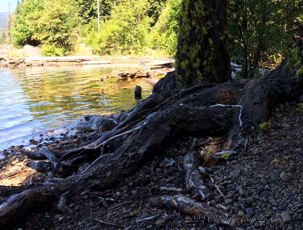 Tree roots exposed in this rocky shoreline exemplify the symbiotic relationship of Earth elements; water, soil and flora.
