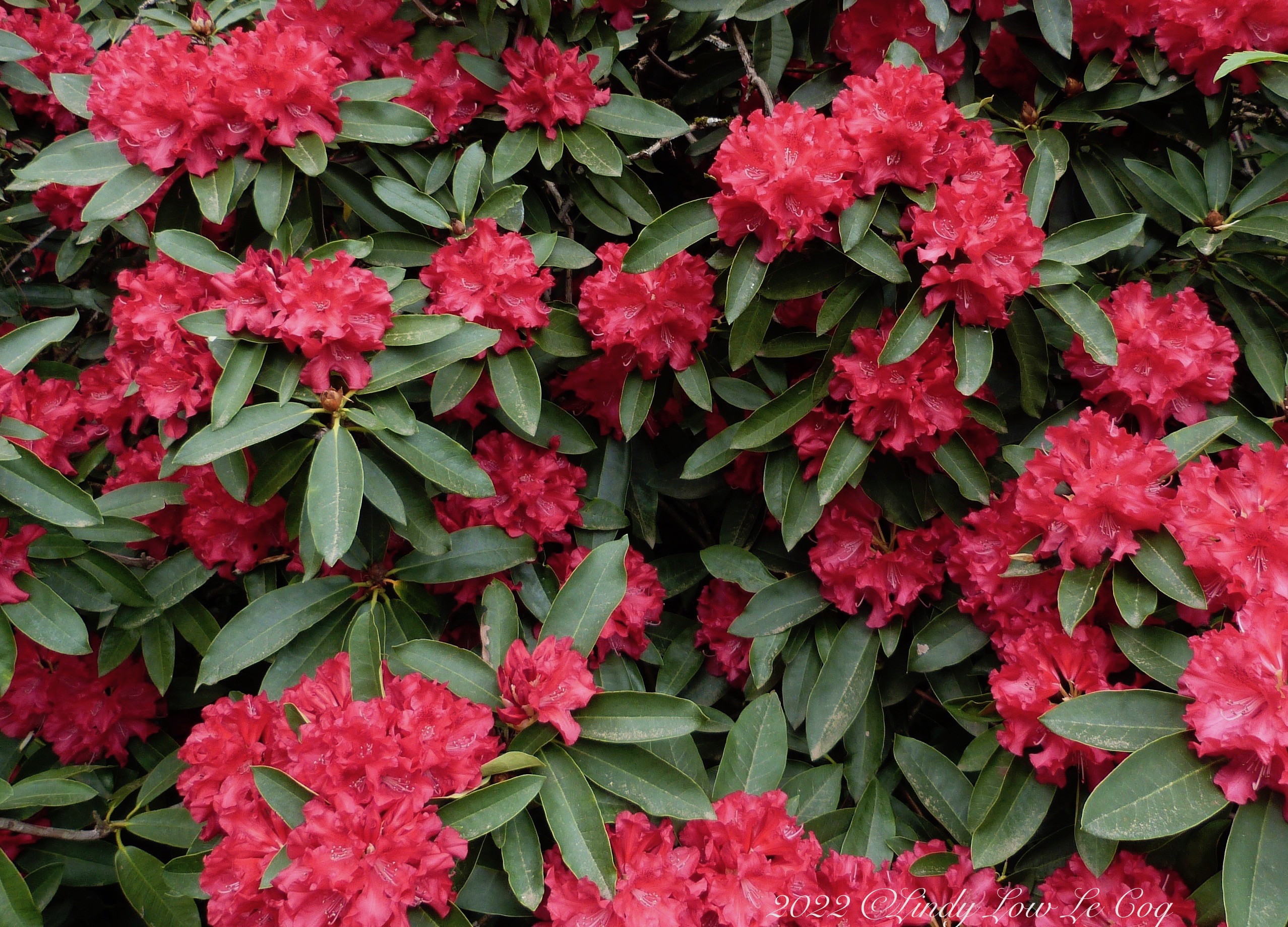 In late spring my rhododendrons bloom a spectacular dark pink, made more vivid by their deep evergreen foliage.