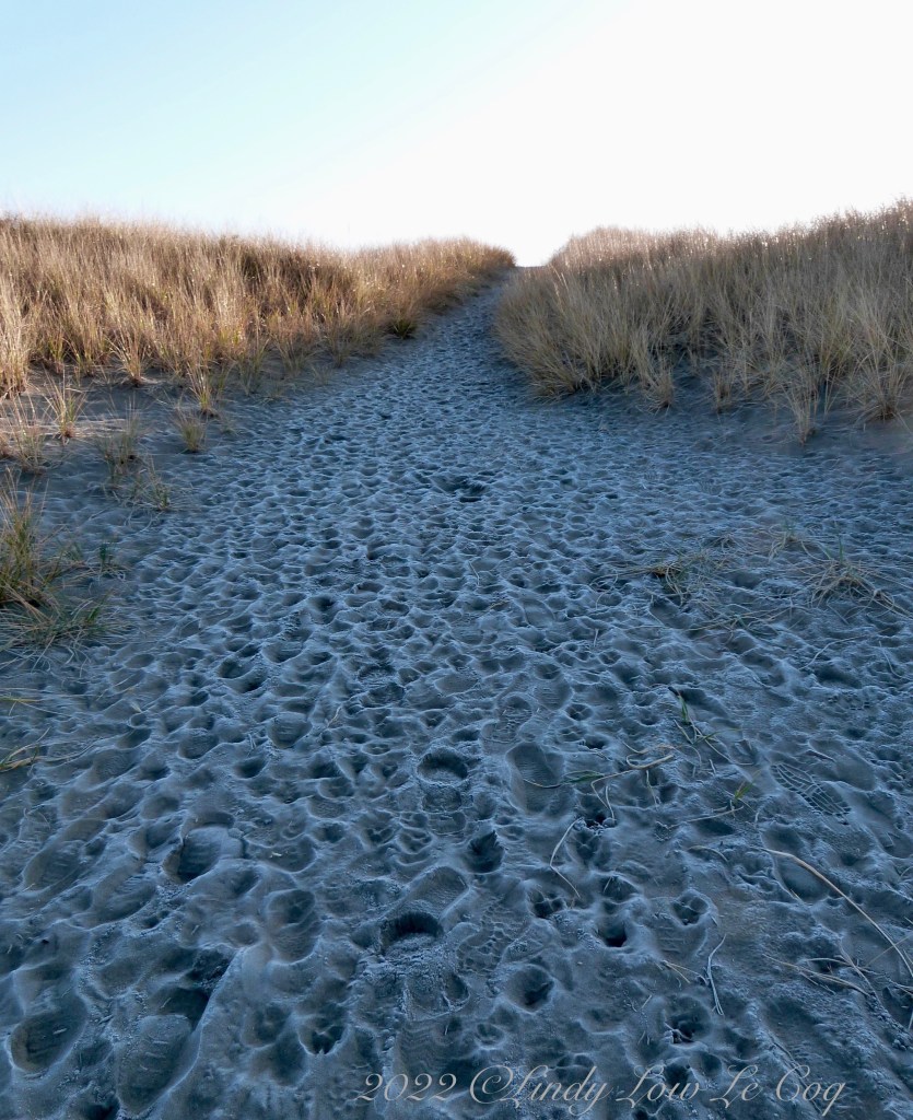 Above, a drift of snow lies undisturbed on a winter evening. In contrast, frozen foot and paw prints on a sand trail to the beach, flanked by frosty dune grass is filled with movement.