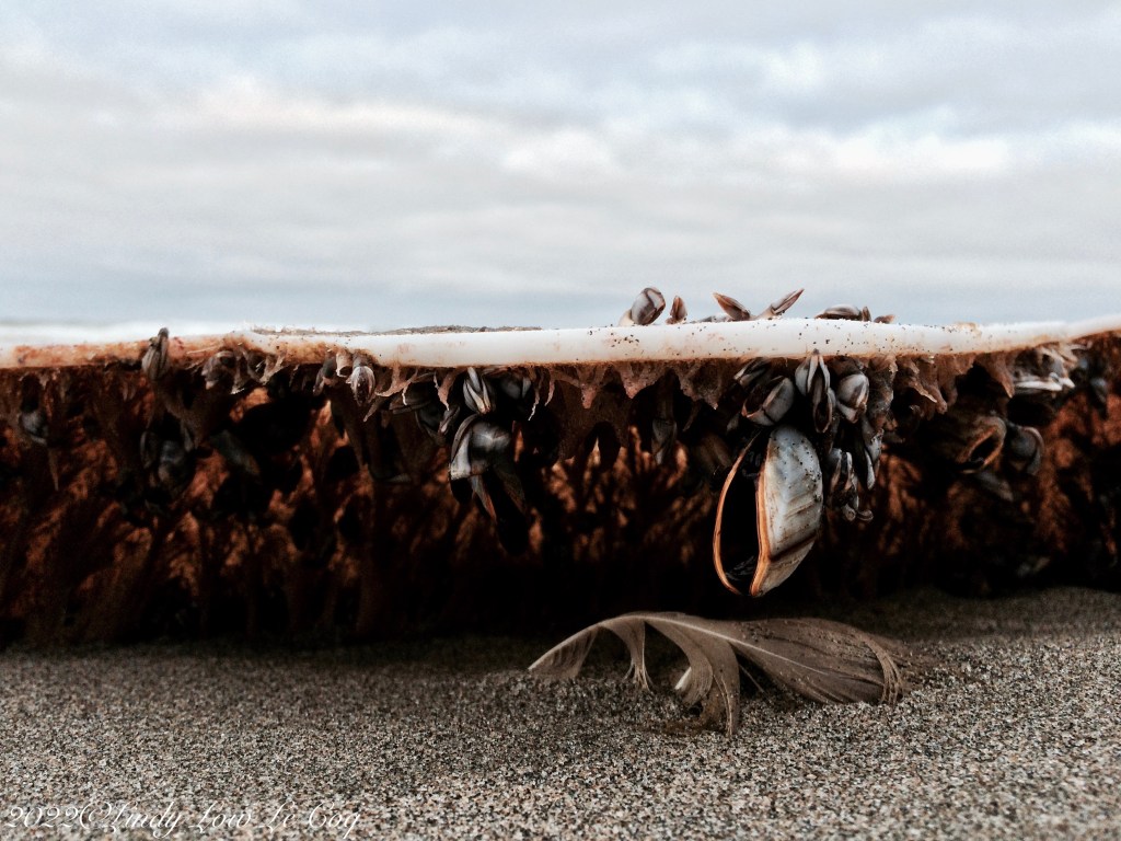 Above, a piece of flotsam on the beach covered in goose-neck barnacles. I put my camera on the sand to take this shot. With the sky above it appears to be large, and the juxtaposition of hard metal and shell with a soft feather adds to its surreal quality.