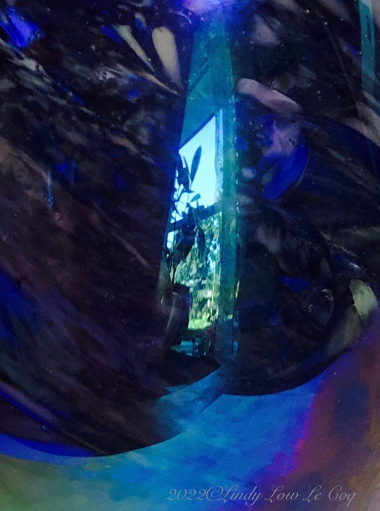 This image conjures a dreamy convoluted path toward an opening of light. It is a shot of a window reflecting on a glass paperweight. The egg-shaped paperweight is colored by Mount Saint Helen’s Volcanic Ash, signed MSH – 82.