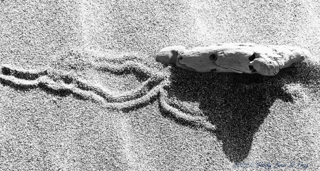My opening image is of a driftwood branch photographed on a foggy morning. In addition to cropping and changing its orientation, I used the process filter (in iPhoto) and reduced the light to achieve this image.