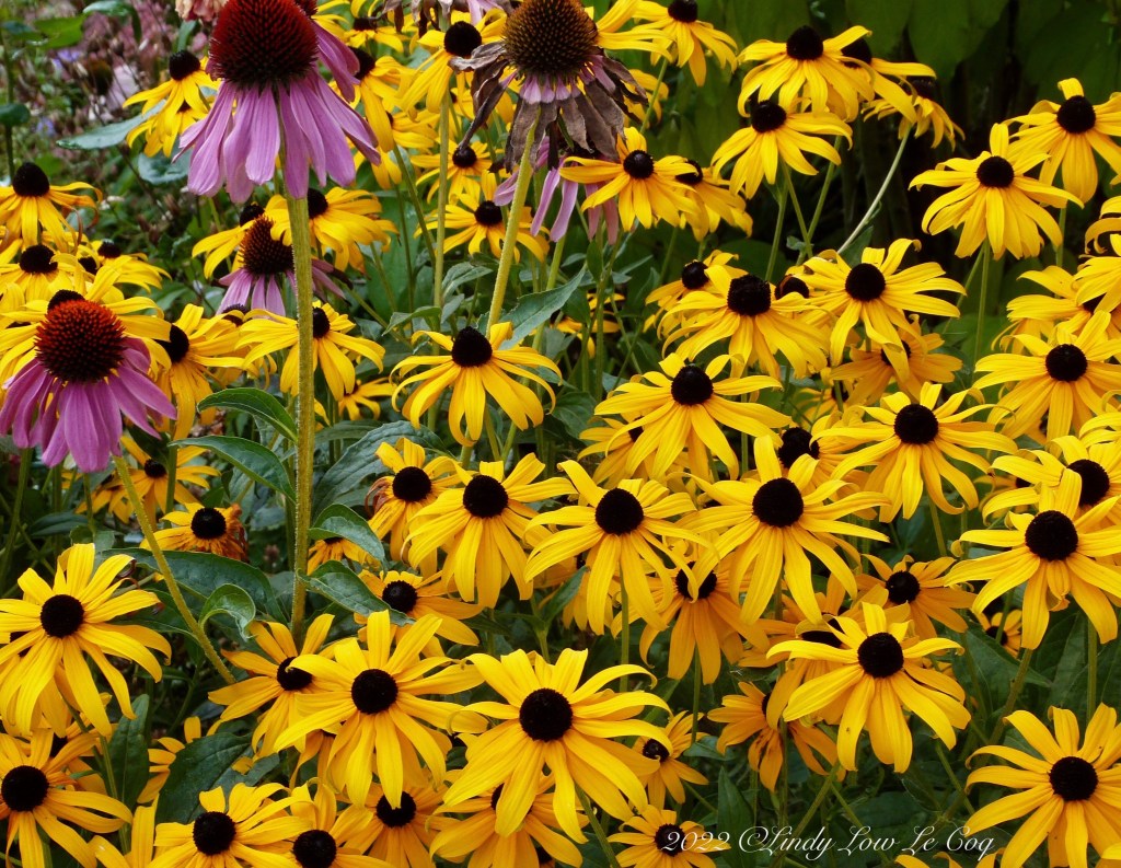 All summer and into late fall, Echinacea better known as Coneflower, and Rudbeckia or Black-eyed Susan flowers fill the sun-drenched border of my front yard. Resident bunnies hop and hide underneath them, and when the petals die back in fall, the seed-heads provide sustenance for migrating finches and other seed eating birds.