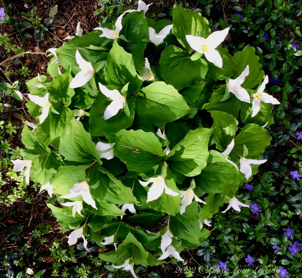 Flowers always invite me to smile, and smiling sends all kinds of positive neural messages through my body that enhance my well-being and improve my disposition. Especially in the short days of winter when I suffer from Seasonal Affective Disorder (SAD). Having flowers blooming in my gardens like the naturalized clump of Trillium surrounded by periwinkle (Vinca minor) below, brightens my life.