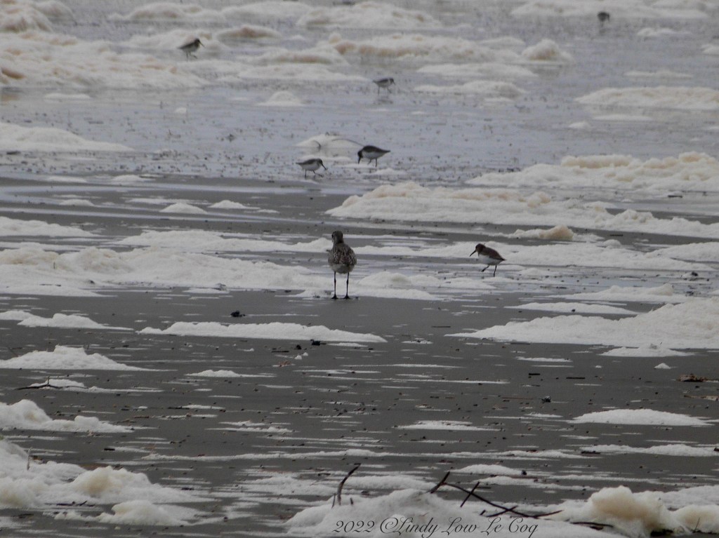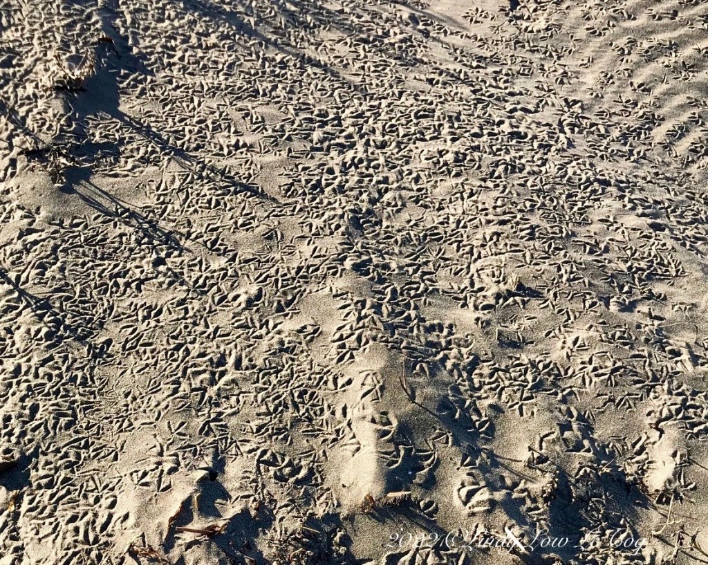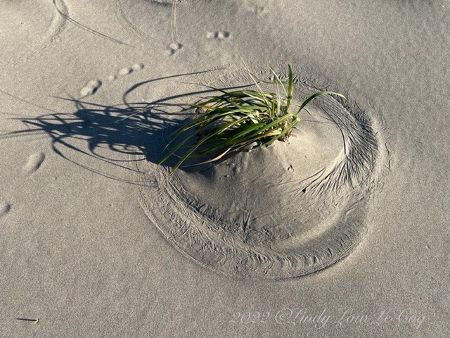 The sandy flatness of Long Beach, WA every day provides a clean slate for all sorts of textures to appear. From upper left dune grass whipped by the wind creates a delicate pattern of lines upon the built up sand. In the background are small tracks of a field mouse. Next is a path to the beach, well trodden by people and dogs and frozen in place on a winter night. In the upper right photo we see where a whole flock of small birds gathered to forage or rest. Bottom left is another critter I just learned about from Steve Morey, called sea gooseberries. These are smaller than the ones he features on his blog: https://theoutershores.com/2022/11/23/shoreside-textures/. On the bottom right, after a king tide swept frothy foam and debris all over the shorelines a variety of shorebirds hunt for grub.
