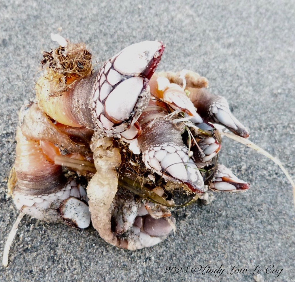 Gooseneck barnacles (Pollicipes polymerus) are another common sight along this beach. *”They attach to rocks or other objects by a strong, rubbery stalk, the peducile, which is up to 10 centimetres (4 in) long.” While I see them more often attached to driftwood stranded on the beach after high tides and strong winds, this cluster looks like it was torn whole from its home.