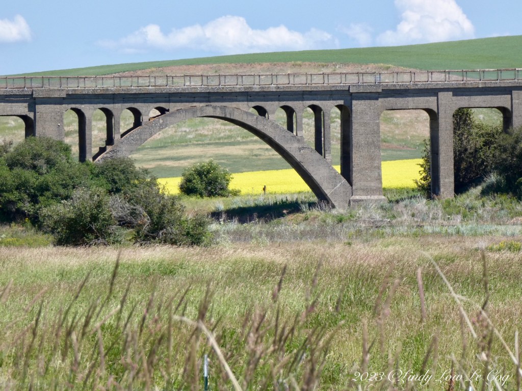 The Rosalia Railroad Bridge, built in 1915 is impressive with its concrete arches. In 1980 the bridge and right-of-way were acquired by the State of Washington. It is listed in the National Register of Historic Places due to its design. Framed by the arches are yellow fields of Canola.