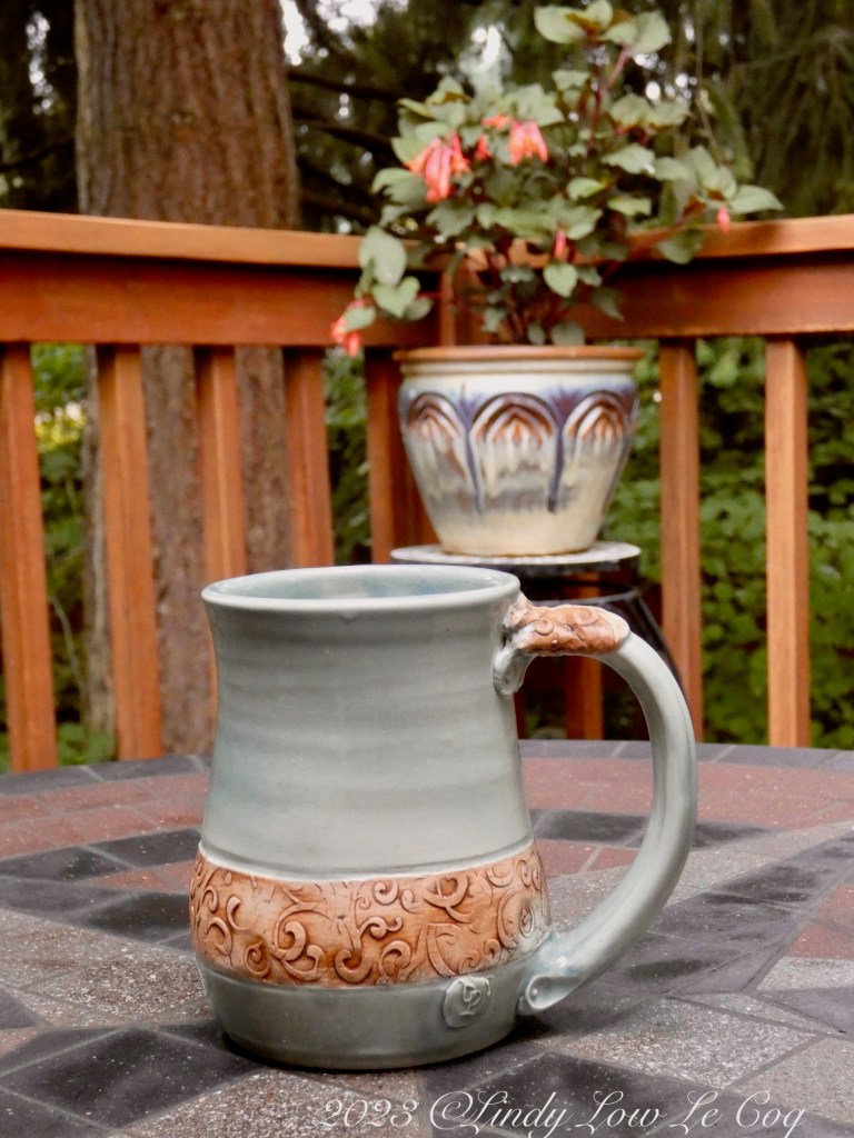 Ritva requested that we include our best-loved cup in this post. Below is a photo of my current favorite, a handmade pottery mug purchased at Bay Street Gallery in Ocean Park, WA. I love to fill it half with milk and half with coffee, and its big enough to last for a while. What a pleasure to sit on the deck of a cool overcast morning sipping my warm mix, as the day unfolds to hot afternoons!