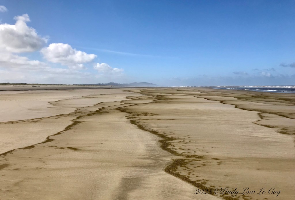 Above, one small cloud in a vast blue sky floats over the dense evergreens of Deschutes National Forest. Below, an extremely low tide at Long Beach, WA is accentuated by a series of receding tide-lines marked on the sand.