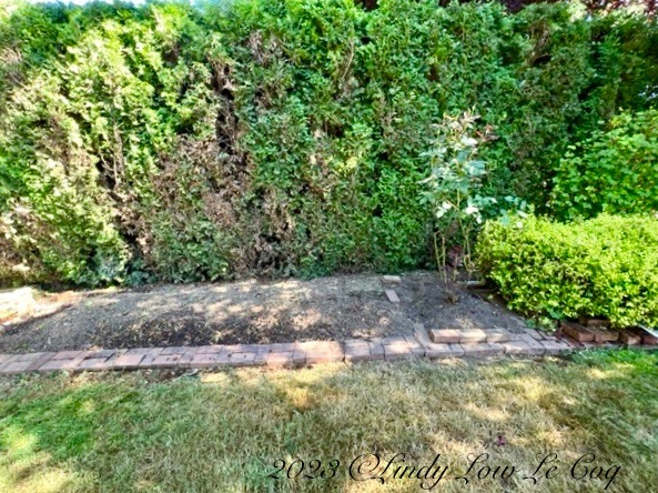 Another plot that I’d made a stab at turning into a rose garden with companion plants, was sputtering. Only one of the roses was pretty and bloomed regularly, and the ground cover had overtaken it all. Below is the cleared space and work in progress with bricks.