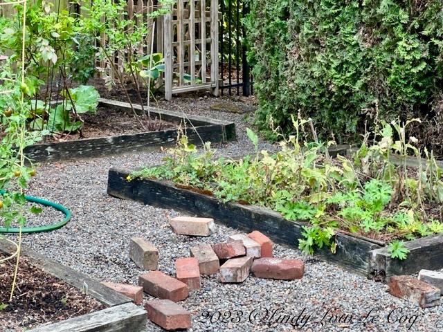 Ann-Christine hit the nail on the head for me with this week’s challenge. Some of my high sunshine gardens were going to waste, with no fruiting vegetables or pretty flowers. After I hired a crew to trim back the arborvitae on one side, and remove them along the fence, I was inspired to dig-in and and get things done! Below, one of the garden plots with fading foxglove, and scattered bricks for the border.