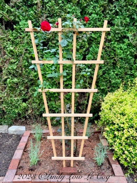 The rose is Oh My!™ a floribunda with medium, bright red, fragrant flowers. After constructing its border, I added French Provençal Lavender as companions, and blessed it with a new trellis. The larger rectangular garden, to the left of the rose square, now has some heirloom zucchini seeds in four hills that may produce before the season is over. The space will be used next year for warm loving vegetables that I’ll select between now and then!