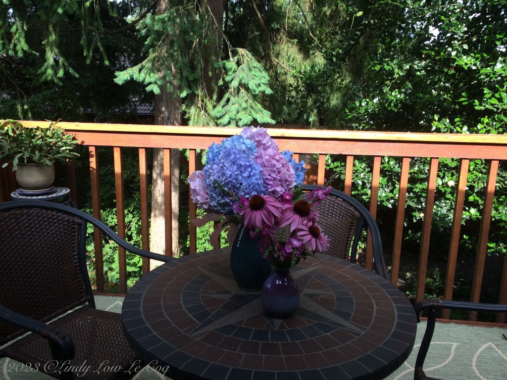 Spring through fall, as weather and temperatures allow, I like to sit on our deck with my morning coffee and in the early evening with a glass of wine. I clear emails, take care of other business on my computer, and read or write. The water fall is audible here, and sometimes it feels like I’m in a tree house.