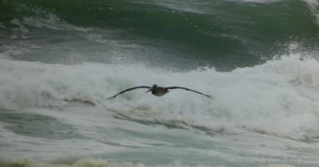 On a cold windy morning, with thunderous surf near high tide, a group of Brown Pelicans plunged into the waves for fish. I couldn’t see where the Pelicans were, or tell if I was getting any photos of them, yet in the end I had a few nice images. This gliding solo bird above the seething surf is one of my favorites.
