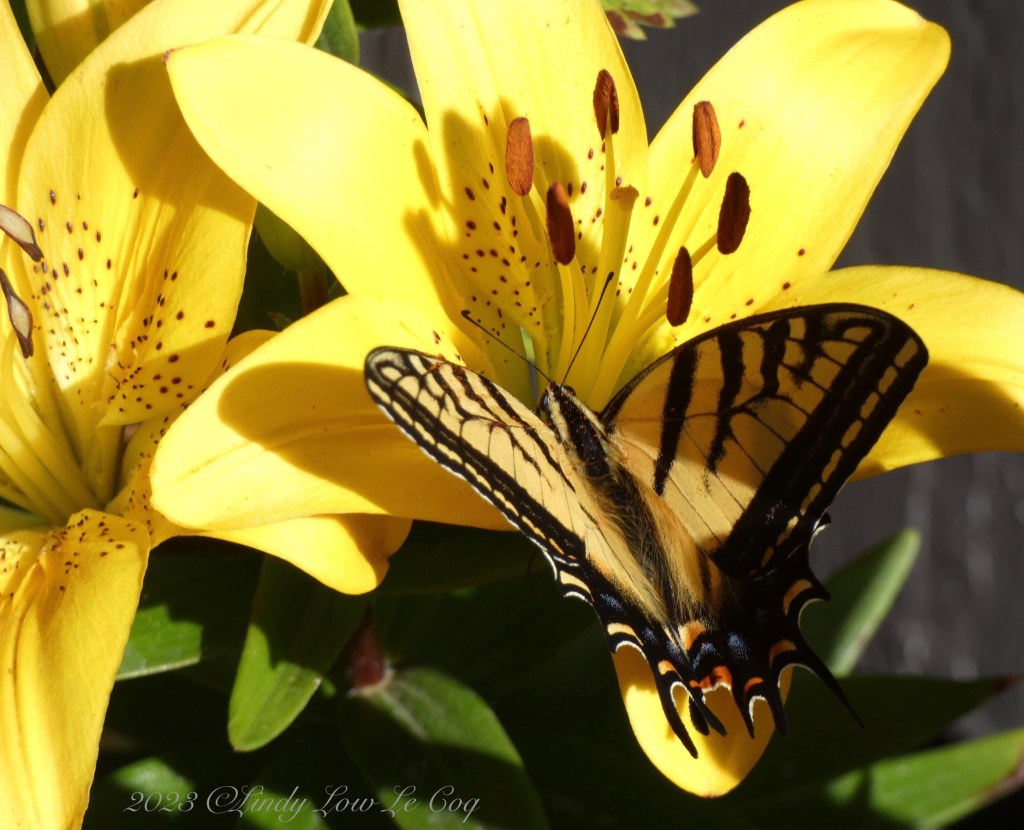 Early morning on Kamiak Butte, in the Palouse hills of Washington State, I watched this Western Tiger Swallowtail butterfly float through the sunshine to land on a bright yellow day lily. It was busy sipping nectar, so I had time to get in close.