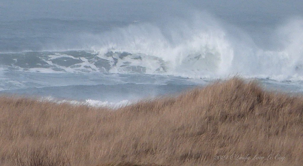 Blurry windblown dune grass, and crests of incoming waves lifted and scattered in a gale.