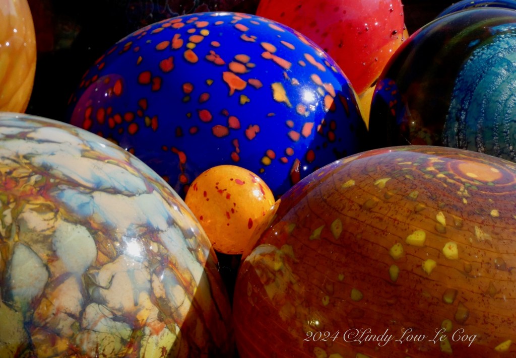 Left above: from the National Blues Museum in St. Louis, three records including “Shake Rattle and Roll”, Jo Turner, 1954, “Tutti Fruiti”, Little Richard 1955,, and “Choo Choo Ch’Boogie”, Louis Jordan & His Tympany Five, 1946. Above right Chihulli Glass Balls.
