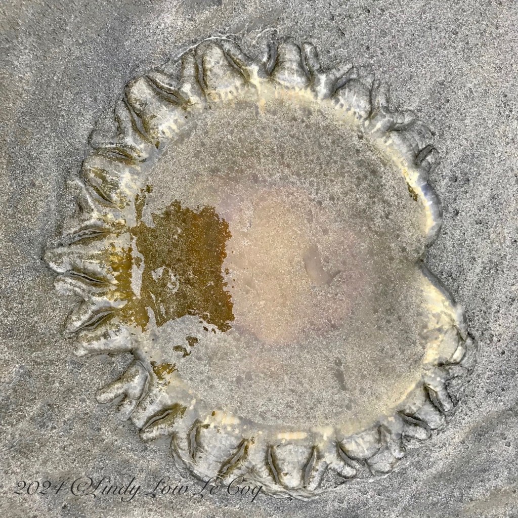 Of course there are many other circular marvels to find when looking down upon our earth. Below, a milkweed seed-head, a sun-shaped jellyfish, an Alloniscus trail (woodlouse going in circles), and a small nest, perhaps Junco.