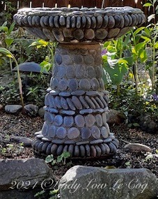 I know I loaded, hauled, unloaded and placed at least a ton or rocks over the years, (I had receipts to prove it), but I was so much younger then! The birdbath, I found at a resource recovery place. Such a wonderful work of craftsmanship.