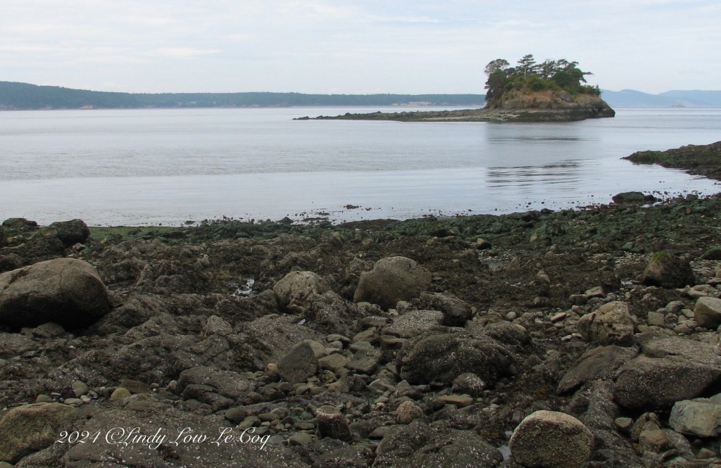 Doughty Point, a 57 acre forested preserve on the NW corner of Orcas Island, WA was a nice hike at low tide from our cabin at Beach Haven Resort. As I walked over and through the beach terrain, I was in awe at the magnificent boulders there. Below left Doughty Point from our cabin, with Freeman Island in foreground. Right, Freeman Island from the shoreline out to Doughty Point.