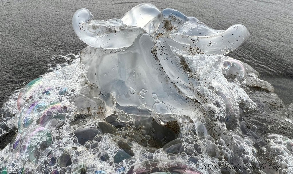 A jellyfish on the shore in a wash of sea-foam bubbles. Jellies are not fish, as they have no backbone. They are simple animals, composed of 95% water, that float in the oceans.
