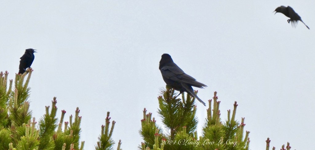 Below is a scene that occurs often in spring when blackbirds pair-up and claim a territory, then other birds, like this crow, flap right down in the middle of it!