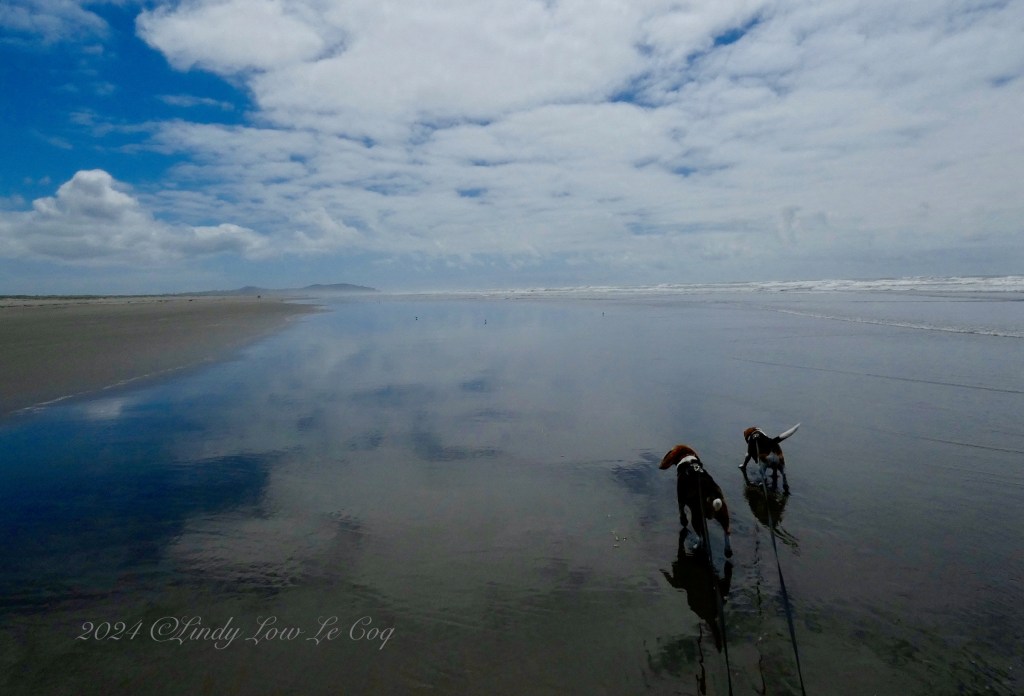 I’ll conclude this post with a photo representing one of my favorite ways to be connected to Earth; walking in the sand at low tide with the roar of our Pacific Ocean in my ears and my sweet Beagles Max (on the left) and Daisy, straining to catch those waves!